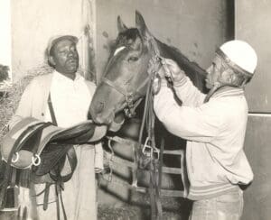 Among the individuals highlighted within the black pioneers exhibit is Jimmy Lee, photographed in 1908, whose career reflects the early twentieth-century presence of Black jockeys in professional racing. Lee was known for winning all six races on June 5th, 1907, at Churchill Downs. She also examines figures such as Oscar Dishman Jr. and Robert Turner, captured together in a 1965 photograph from Keeneland Library collections.